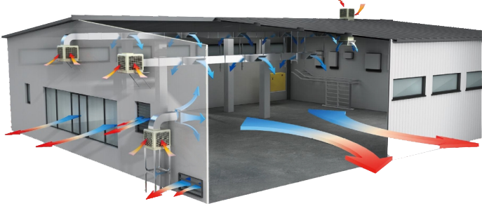 3、營造新風環(huán)境,可以達到單獨使用大風扇或單獨使用蒸發(fā)式冷風機均無法達到的全方位環(huán)境改善目標;